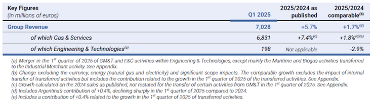 In detail, sales amounted to 7.0 billion euros in the first quarter of 2025, up +1.7% on a comparable basis (+5.7% as published, reflecting a positive currency impact and the rise in energy prices, changes in which are passed through to our customers). Sales in our Gas & Services businesses, which represent 97% of Group sales, were up +1.8% on a comparable basis. In particular, sales increased by +3.6% and +5.3%, respectively, in the areas of Electronics and Healthcare. Electronics is driven by the rapid development of artificial intelligence, while the activity in Healthcare follows a dynamic that is distinct from economic developments in the industrial sector.